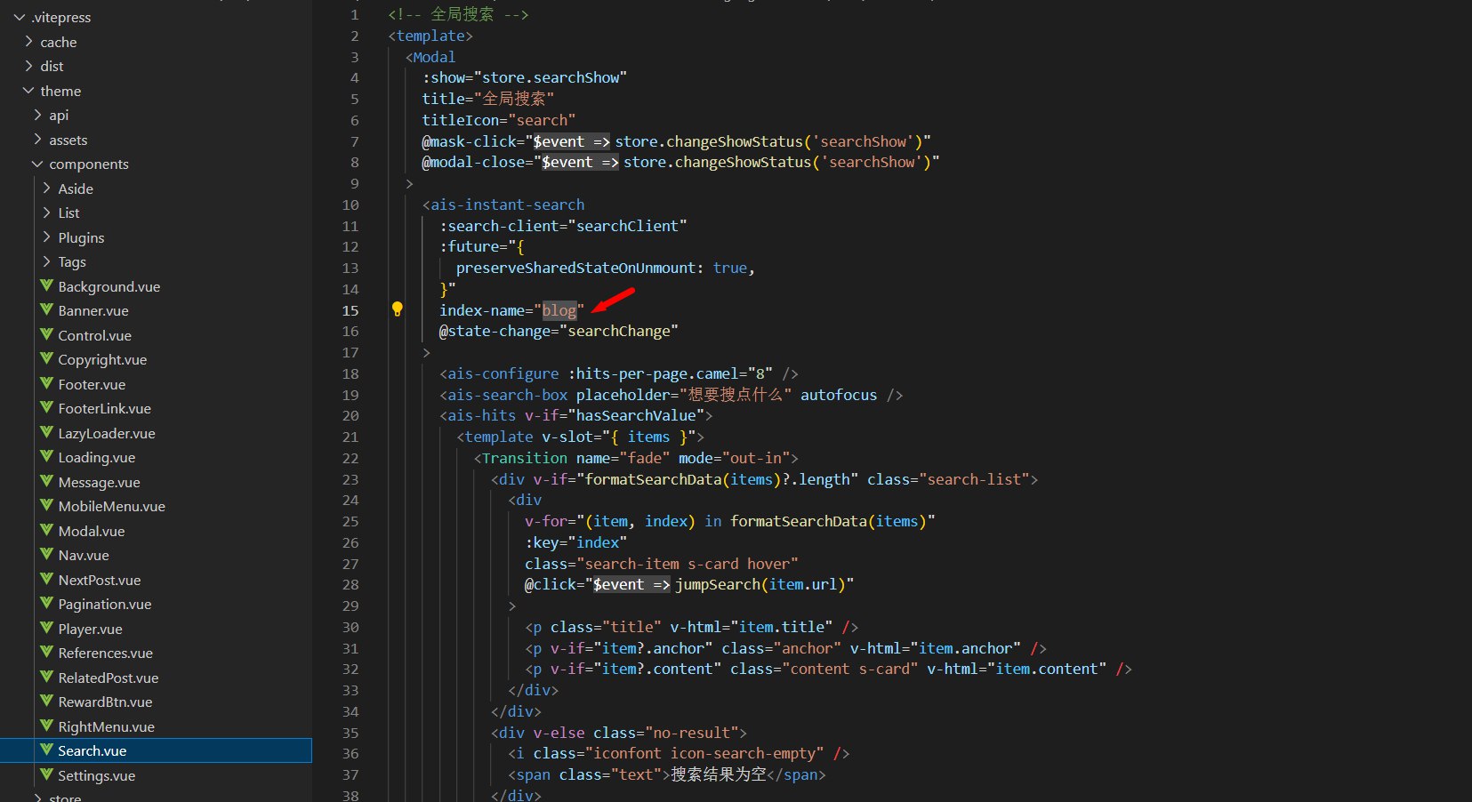 由于DocSearch的的数据库配置没有加到 assets\themeConfig.mjs 的配置中,需要在 components\Search.vue 中的第15行修改为自己的数据库。